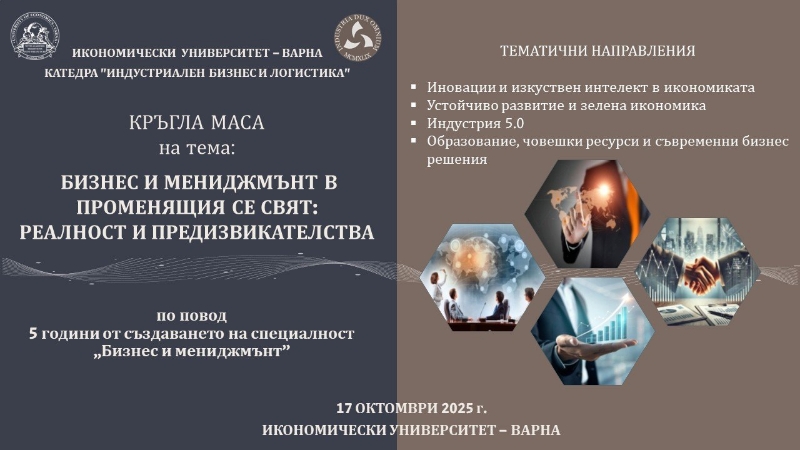 От 10.00 часа в зала 320 ще започне кръгла маса по повод 5 години от създаването на специалност „Бизнес и мениджмънт” в Икономически университет – Варна на тема "Бизнес и мениджмънт в променящия се свят: реалност и предизвикателства".