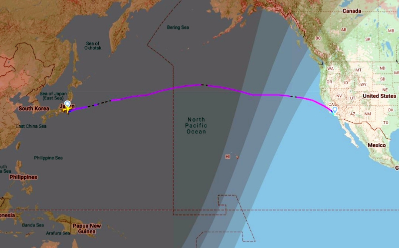 Авиалайнер Boeing 787 All Nippon Airways во время рейса NH106 взлетел в 01:06 1 января 2026 года в Токио и прибыл в 17:45 31 декабря 2025 года в Лос-Анджелес.